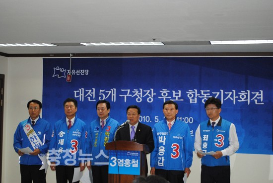 이에 우리 자유선진당 소속 5명의 구청장 후보들은 한나라당 소속 시장, 구청장 후보들에게 충청발전과 직결되는 3개항에 대해 공개질의하는 바이며, 이에 대한 입장을 분명히 해 줄 것을 요구하는 바이다.