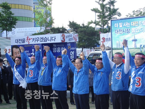 염홍철 시장후보는 서대전 시민공원에서 한국노총회원들의 지지를 받으며 유세를 갖고 세종시 원안사수와 원도심 활성화, 여성,육아 복지정책 공약을 발표회를 가지며 지지를 당부했다.