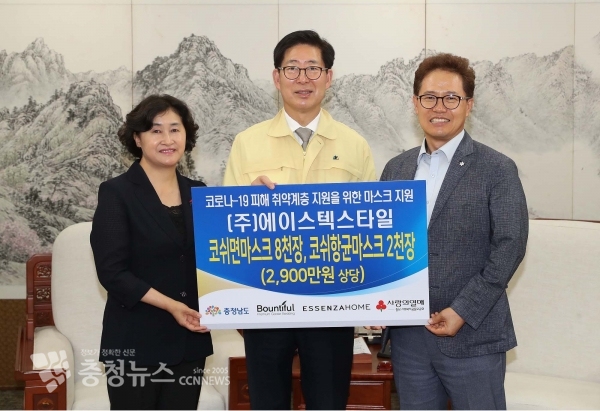 이날 2900만 원 상당의 면마스크 8000장과 항균마스크 2000장 등 총 1만 장을 받았으며 충남 사회복지공동모금회를 통해 도내 취약계층 등에 전달할 계획이다.