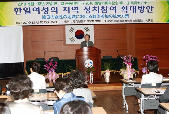 충남여성정책개발원(원장 김경숙 / 공주시 반포면 소재) 은 1일대강당에서 한‧일 여성 관련 전문가 100여명이 개원 11주년을 맞아『여성의 지역 정치참여 확대방안』이라는 주제로 세미나를 개최했다고 했다.
