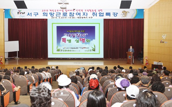 대전시 서구(구청장 가기산)는 23일 구청 대강당에서 희망근로 사업에 참여하고 있는 근로자 450명을 대상으로 재취업을 위한 특강을 열었다.