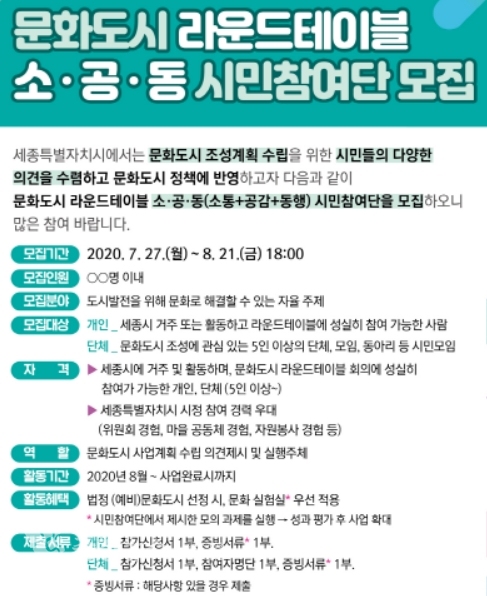 세종특별자치시(시장 이춘희)가 문화체육관광부 주관의 법정 문화도시 조성을 위해 다양한 시민 의견을 수렴해 문화정책에 반영하고자 ‘문화도시 라운드테이블 소·공·동 시민참여단’을 모집한다.