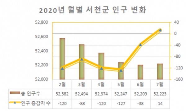 서천군(군수 노박래)은 7월 총인구수 집계 결과, 지속적인 감소를 멈추고 6월보다 14명이 증가했다고 밝혔다.