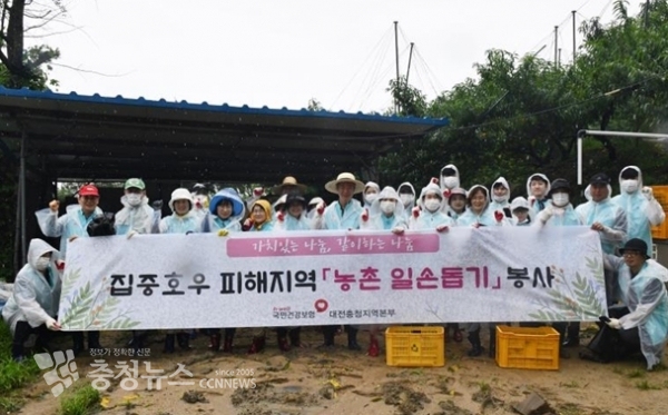 국민건강보험공단 대전충청지역본부(본부장 성백길)이 11일 집중호우로 농작물 피해를 입은 세종시 연동면 농가에 방문하여 수해복구를 위한 농촌일손돕기 봉사활동을 시행해 잔잔한 감동을 주었다.