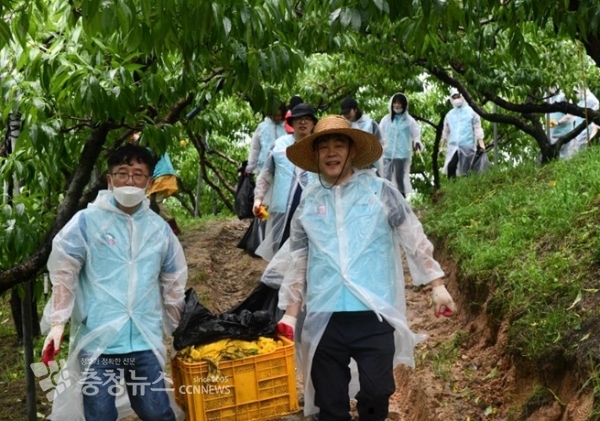 국민건강보험공단 대전충청지역본부와 세종지사 직원 40여명은 이 날 복숭아 낙과 피해를 입은 농가에 방문하여 폭우 속에서 최선을 다해 일손을 보탰다.