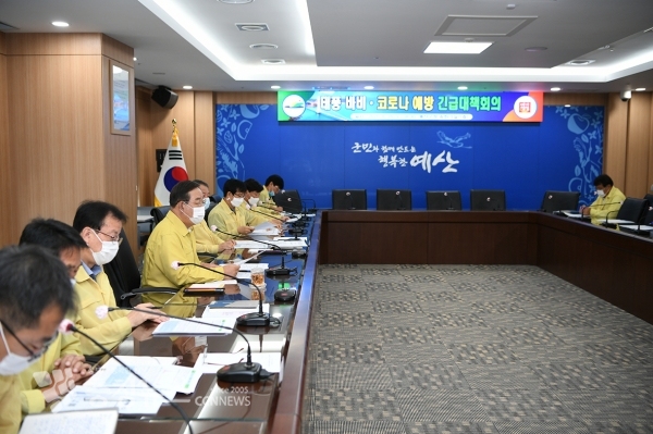 예산군은 26일 군청 중회의실에서 황선봉 군수 주재 재난 대비 긴급 특별대책회의를 개최하고 코로나19 확산에 따른 방역대책 및 제8호 태풍 '바비' 북상에 따른 대책을 논의했다.
