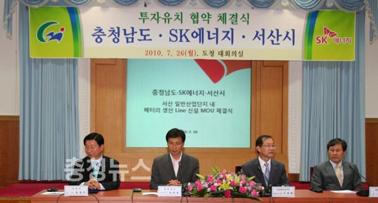 충남도 안희정 지사, 유상곤 서산시장, 구자영 SK에너지(주)대표이사(사장)는 26일 도청 대회의실에서 서산 일반산업단지 내 23만1,000㎡(약 7만평)에 전기자동차 배터리 생산라인을 건설하는 투자 협약(MOU)를 체결했다.