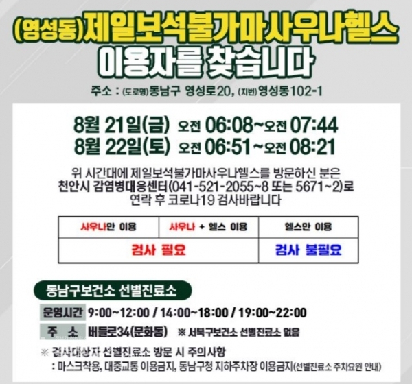 천안시가 최근 코로나19 확진 판정을 받은 영성동 제일보석불가마사우나헬스(도로명: 동남구 영성로 20, 지번: 영성동102-1) 이용자를 찾는다는 공지를 28일 올렸다.