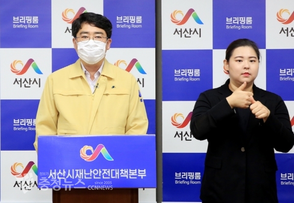 비대면 긴급 언론 브리핑 하는 맹정호 서산시장
