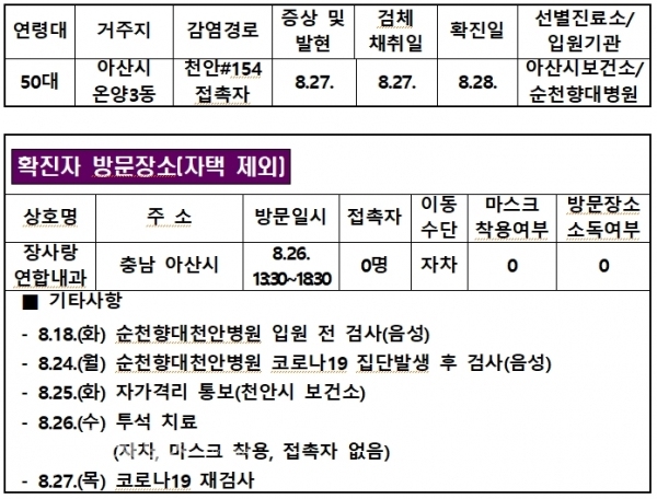 확진자는 투석 치료로 순천향대병원 입원 중 집단 코로나19 발생으로 인해 응급 중환자실 폐쇄 및 퇴원. 주3회 투석을 받아야 하는 중환자로,