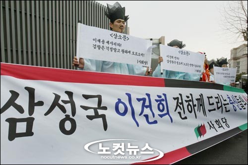 10일 오전 서울 한남동 이건희 삼성그룹 회장 자택앞에서 이회장의 장남 이재용에 대한 편법적인 권력승계를 규탄하는 퍼포먼스 시위가 있었다. 시위에 참가한 사회당원들은 선비와 장수의 복장을 하고 이회장의 자택 앞까지 행진해 자리를 펴고 상소문을 낭독한 후 상소문을 전달하는것으로 퍼포먼스 시위를 마쳤다. 노컷뉴스 류승일 기자 저작권자 © 충청뉴스 무단전재 및 재배포 금지 편집국 다른기사 보기 기사가 마음에 드셨나요? 충청뉴스 좋은 기사 후원하기 1,000원 3,000원 5,000원 10,000원 30,000원 50,000원 직접입력 비회원 약관동의하기 ※ 소중한 후원금은 더 좋은 기사를 만드는데 쓰겠습니다.