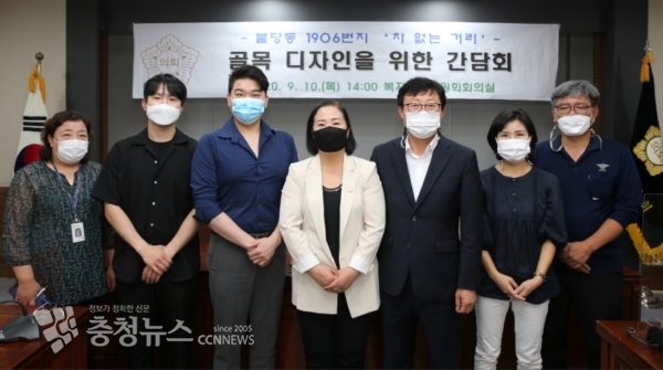 이날 간담회는 김선홍 의원과 상인회장 박준호ㆍ사무국장 한순희, 청소행정과 윤석기 과장을 비롯한 건축디자인과, 서북구 건설과, 불당동 공무원들이 함께 참석하여 불당동 1906번지 일원의 차없는 거리 활성화를 위한 골목 디자인 방안을 모색했다.