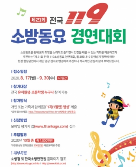119소방동요 경연대회는 매년 각 시ㆍ도 예선에서 최우수상을 받은 팀이 모여 전국무대에서 경연을 펼쳤지만 올해는 코로나19 확산 방지를 위해 운영 방식이 영상공모제 형식으로 달라졌고, 심사 없이 무작위 추첨을 통해 300명(팀)에게 5만원 상당의 문화상품권이 제공된다.