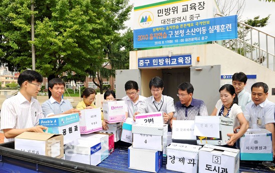 대전 중구(구청장 박용갑)는 17일 2010 을지연습 기간을 이용하여 적의 청사침입을 가상해 ‘본청 소산 및 이동훈련’을 실시했다고 밝혔다.