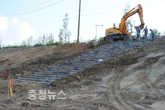 ▲ 갑천변에 위치한 파크골프장 계단공사 중