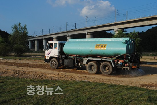 ▲ 갑천변에 위치한 파크골프장 현장 살수차
