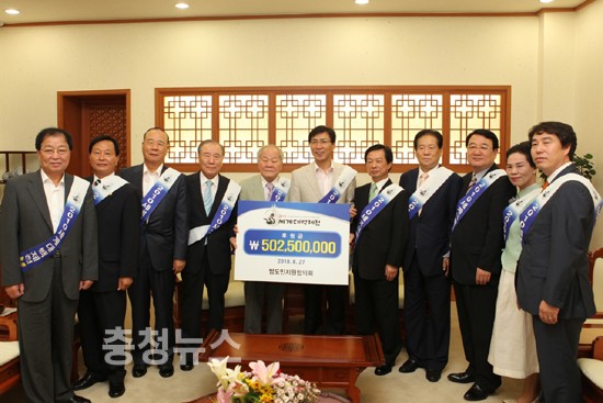 이인구 ‘2010 세계대백제전’ 범도민지원협회장(계룡건설 명예회장)은 8월 27일 오전 9시 30분 충남도청을 방문해 안희정 충남지사에게 ‘2010 세계대백제전’의 성공적인 개최를 기원하며 범도민지원협의회 후원금 5억250만원(기납부액 3억원 포함)을 기탁했다.