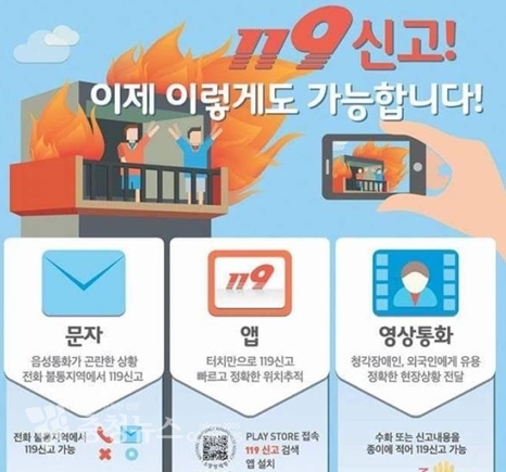 서산소방서(서장 강기원)는 재난 발생 시 음성통화 외에도 문자(SMS, MMS), 앱(APP), 영상통화 등을 이용한 119 다매체 신고서비스를 적극 홍보한다.