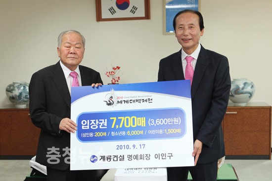 이인구 계룡건설 명예회장(계룡장학재단 이사장)은  17일 오전 9시 대전시교육청을 방문해 김신호 교육감에게 ‘2010 세계대백제전’ 입장권 7700매(3600만원 상당)를 전달했다.