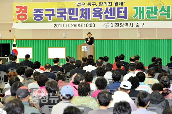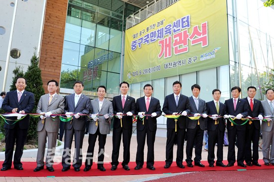 대전 중구(구청장 박용갑)는 28일 중구민의 숙원사업이었던 중구국민체육센터를 선화동 186-14번지에 완공, 내빈과 생활체육 동호인 등 500여 명이 참석한 가운데 개관식을 갖고 본격적인 운영에 들어갔다.