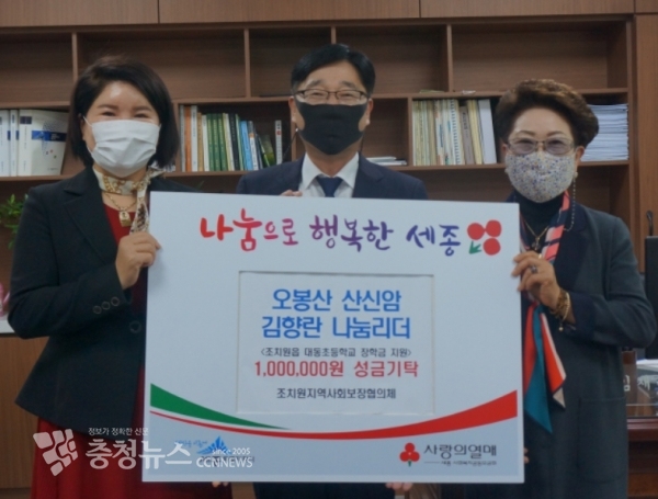 이 날 성금전달식은 조치원읍사무소 읍장실에서 임재공 조치원읍장, 장인자 대동초등학교 교장, 오봉산 산신암 김향란 주지가 참석한 가운데 이루어졌다.