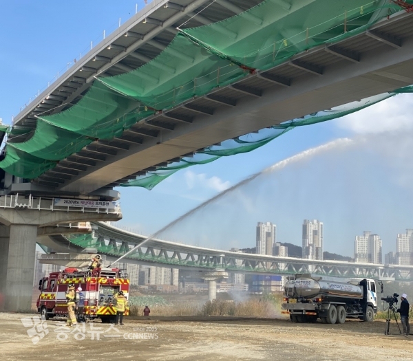 LH 세종특별본부(본부장 임동희, 이하 LH)는 29일, 세종시 연기면에 위치한 금강보행교 건설공사 현장에서 화재 및 근로자 추락 사고에 대비한 “2020 재난대응 모의훈련”을 실시했다.