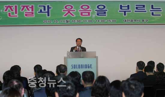 대전 동구(구청장 한현택)는 11일 솔브릿지 국제대학 대강당에서 전 직원을 대상으로‘친절과 웃음을 부르는 뇌’라는 주제로 고객중심의 행정서비스 제공을 위한 친절마인드 향상 교육을 실시했다.