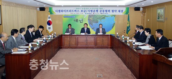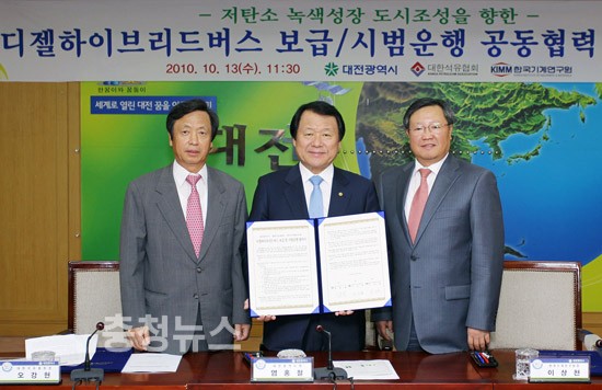 대전시(시장 염홍철)는 13일 오전 시청 중회의실에서 한국기계연구원, 대한석유협회와 디젤하이브리드 버스 개발 및 시범운행을 위한 업무협약(MOU)을 체결했다.