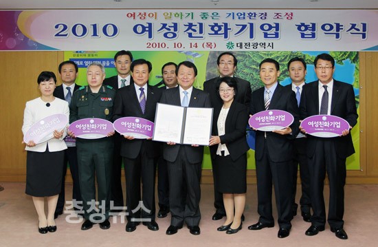 대전시(시장 염홍철)는 14일 오전 시청 중회의실에서 국군대전병원, 대전교차로(주), 한국조폐공사, ktcs 대전사업단 등 10개 지역 여성친화기업 대표들이 참석한 가운데 ‘2010 여성친화기업 인증 및 협약식’을 가졌다.