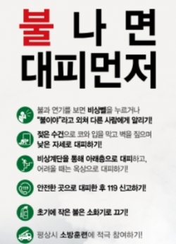 유장균 화재대책과장은 “소화기 사용법과 119 신고요령도 중요하지만 화재 발생 시 무엇보다 안전한 장소로 신속하게 대피하는 것이 최우선이다”며 “시민들이 ‘불나면 대피먼저’를 먼저 떠올릴 수 있도록 집중 홍보하도록 하겠다”고 말했다.