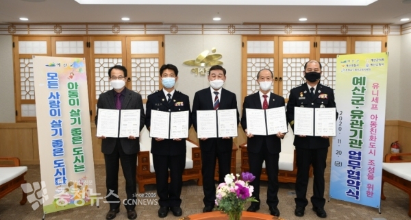 예산군(군수 황선봉)은 20일 아동의 기본권리가 보장되는 행복한 아동친화도시(Child Friendly City) 조성을 위해 아동 관련 4개 기관인 예산군의회, 예산경찰서, 예산교육지원청, 예산소방서와 업무협약을 체결했다.