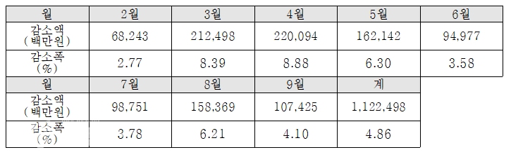 월별로 도내 서비스업은 지난 2월 682억 원(2.8%), 3월 2124억 원(8.4%), 4월 2200억 원(8.9%) 5월 1621억 원(6.3%) 6월 949억 원(3.6%) 7월 987억 원(3.8%) 8월 1583억 원(6.2%) 9월 1074억 원(4.1%) 등의 감소를 보였다.