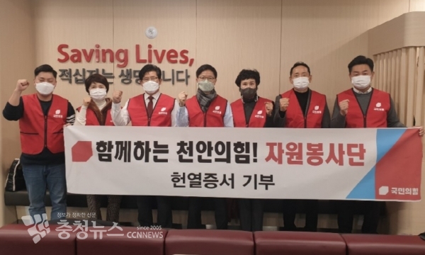 국민의힘 천안을 당협위원회(위원장 이정만) 자원봉사단인 `함께하는 천안의힘! 자원봉사단(단장 정도희 시의회 부의장)은  7일 헌혈 봉사 및 111장의 헌혈증서 기부행사를 가졌다.