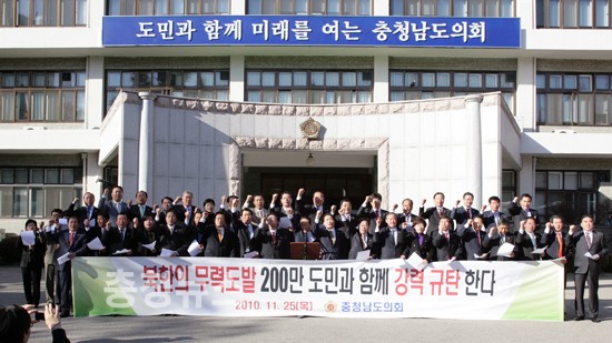 충남도의회(의장 유병기)는 25일 오후 의회 청사 앞에서 지난 11월 23일에 벌어진 북한의 연평도 무력도발을 의회 차원에서 강력히 반대하고 재발 방지를 위한 “북한의 무력도발 규탄 결의대회”를 개최했다.