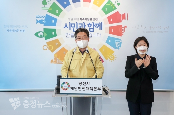 김홍장 당진시장은 21일 코로나19 관련 긴급 브리핑을 통해 '당진시 사회적거리두기 2.5단계'의 방역수칙을 발표했다.