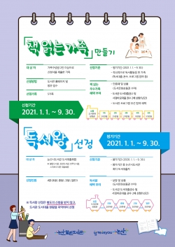‘책 읽는 가족 만들기’는 오는 1월부터 9월 말까지 가족 구성원 2인 이상으로 신청서를 제출한 가족을 대상으로 진행되며, 1월~9월까지의 평가기간 동안 도서대출, 프로그램 참여 등 적극적인 독서활동을 펼친 5가족을 선정하여 상패 및 상품을 시상할 예정이다.