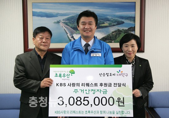 이번 후원금은 관내 어려운 이웃 1가구를 KBS 사랑의 리퀘스트에 추천해 한국토지주택공사 임대주택 보증금으로 308만원의 후원금을 전달하게 됐다.