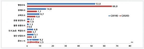 시민들은 시가 발표한 ‘2020년 세종시 사회조사 결과’에서 향후 ‘세종시가 어떠한 도시로 발전하길 희망하는가’에 대한 질문에 66.0%가 ‘행정수도’를 선택했으며, 다음으로 문화도시(9.5%), 경제도시(7.7%), 교육도시(6.6%) 순으로 답했다.