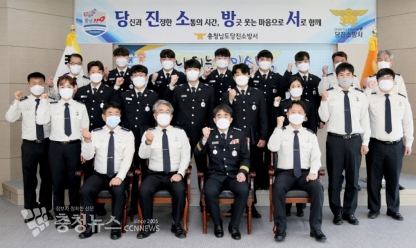 유현근 당진소방서장은 6일 “당진소방서의 가족이 된 걸 환영한다”며 “새로운 근무환경에 적응해 출동 태세를 확립하고 지역주민으로부터 신뢰와 사랑받는 소방서가 되도록 앞장서주길 바란다”고 당부했다.