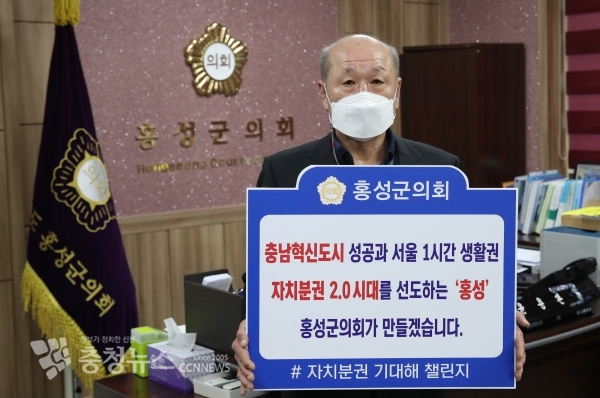 윤용관 홍성군의회의장이 14일 ‘자치분권 기대해 챌린지’에 동참하며 충남혁신도시 조성 등 당면업무 추진 시 주민중심의 지방자치가 실현될 수 있도록 자치분권 2.0을 선도해 나가기로 했다.