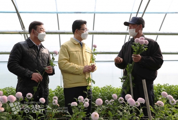 황선봉 군수와 양승조 도지사가 예산 화훼 재배 농가를 방문했다.