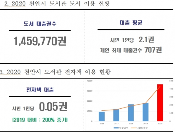 지난해 천안시 도서관 대출률은 코로나19로 인한 휴관 및 서비스 제한으로 2019년 대비 33% 감소했으나, 국립중앙도서관이 분석한 전국 도서관 감소율 45.9%보다는 적은 수준으로 나타났다.