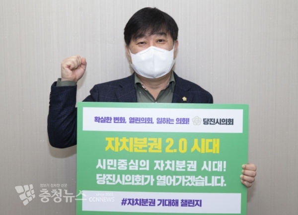 최창용 충남 당진시의회 의장은 27일 “시민중심의 자치분권 시대! 당진시의회가 열어가겠습니다”라고 쓰인 팻말을 든 사진을 개인 SNS에 올리며 자치분권 2.0시대 개막을 응원하는 ‘자치분권 기대해’챌린지에 동참했다.