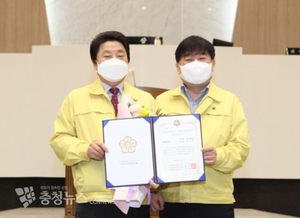 임종억 의원(좌), 최창용 의장으로 부터 ‘대한민국 지방자치평가 의정대상’수상