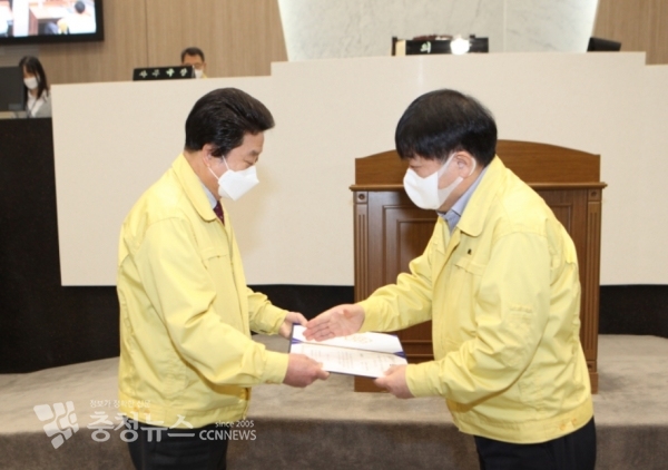 인종억 의원(좌) 수상후 최창용 의장과 함께