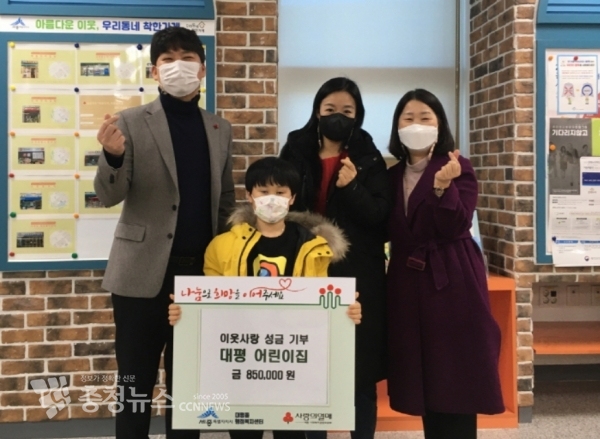 세종특별자치시 대평동(동장 차하철)에 위치한 대평 어린이집(원장 신선영)이 최근 대평동 행정복지센터를 찾아 어려움을 겪고 있는 이웃을 위해 성금 85만 원을 기부해 잔잔한 감동을 주고있다.
