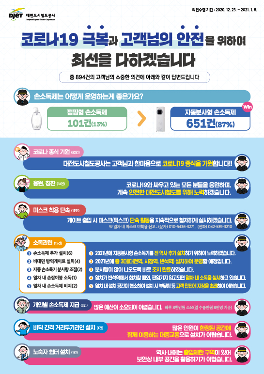 응답 시민 142명중 88명은 공사와 대전시, 의료진에 대한 칭찬과 응원의 메시지를 남겼고 59명은 마스크단속 강화, 비대면 방역게이트 설치 등 코로나19 예방을 위한 다양한 의견을 제시했다.