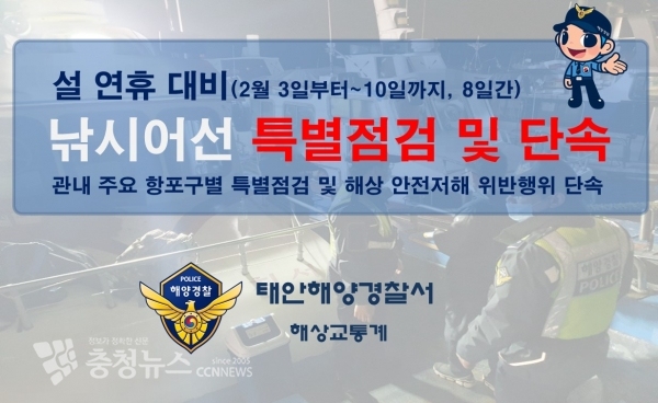 충남 태안해양경찰서(서장 윤태연)는 낚시어선 이용객 증가가 예상되는 설연휴 기간 중 관련 사고 예방을 위한, 선제적 안전관리 강화에 나선다.
