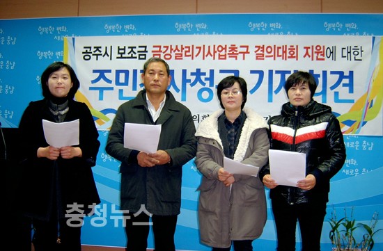 한편, 이들은 굳이 주민감사청구를 하는 것은 권력의 횡포를 견제하고 감시하는 제도적 장치 없기 때문에 이런일 발생한다며 참여와 소통을 통한 견재를 하기 위해서이며 또하나는 4대강 여론을 왜곡한 공주시에 대한 철저한 평가가 이뤄져야 한다는 생각에서 하게 됐다고 밝혔다.