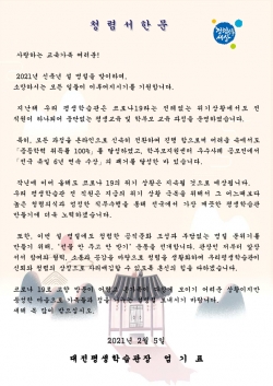 그러면서 “지속적인 관심으로 대전교육 가족의 청렴 다짐을 응원해 줄 것”을 당부하며 “가족들과 정을 나누는 따뜻한 명절이 되기를 기원한다”고 말했다.